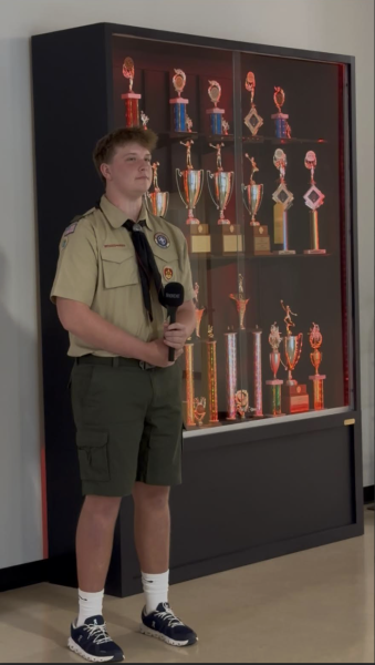 One of many on-campus Eagle Scout and Heritage Girls projects housed on Cross Campus, the cabinets carry a small plaque honoring Caleb’s troop, Troop 222. Caleb led a team of 14 scouts all engaged in building the trophy case, a project that took 314 hours to compete. Reflecting on the project, Caleb remarks that “Despite all the planning and hard work on my part, absolutely nothing would have been accomplished without the generosity and selflessness of those who assisted in the journey.”